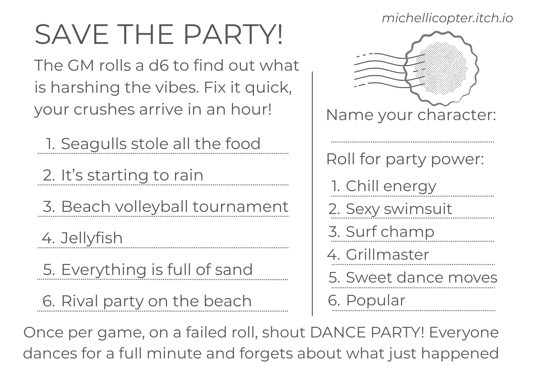 A quick little game for a group of people to get silly with. Print it as a postcard, put it in your bag, pull it out at the bar, have a laugh, save the party.