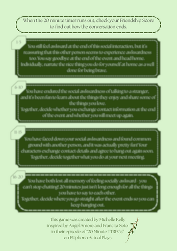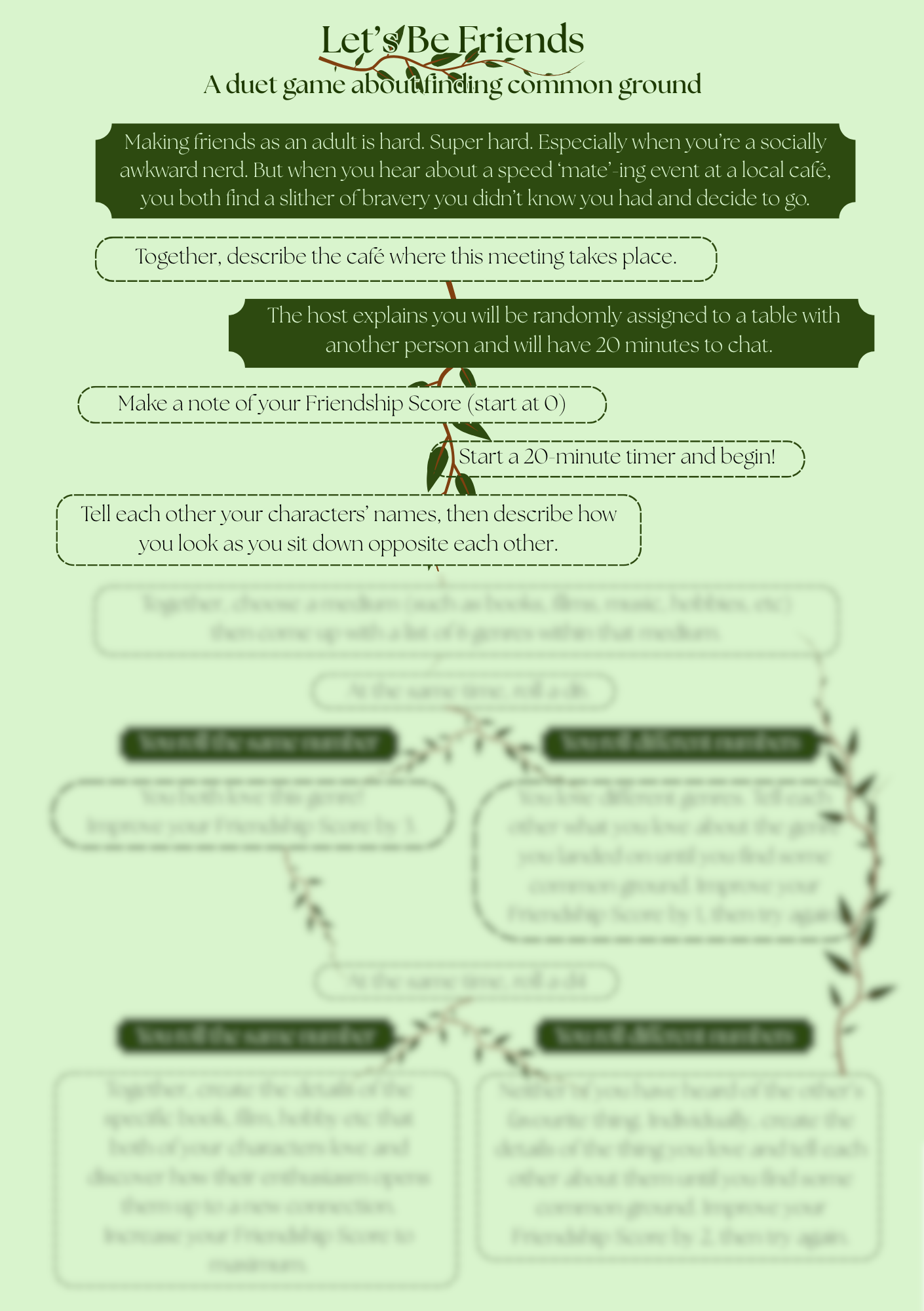 In this short and simple duet game, you and a friend will create two nerdy characters and play through a 20-minute conversation in real time, rolling dice to inspire your characters' favourite books, films, music and more and trying to find some common ground. Track your Friendship Score and, when your time is up, use it to prompt your ending. Will you make a new connection? You have 20 minutes to find out.