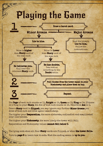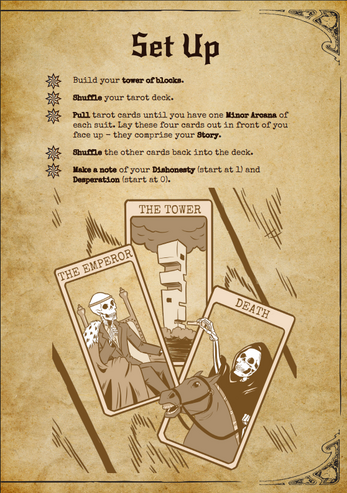 Pull cards from a tarot deck to select from over forty minimalist, open-ended prompts, guiding you to build your own narrative based on what they suggest. A wooden block tower tracks your dishonesty - the longer your story becomes, the more risk of it all falling apart.
