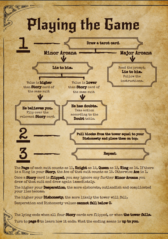 Purchase of this game includes a digital PDF of the full zine, and a plain text PDF for accessibility. You will also get free access to the Lie To Him mobile app, which makes it possible to play through the game without physical tarot cards or a wooden block tower.